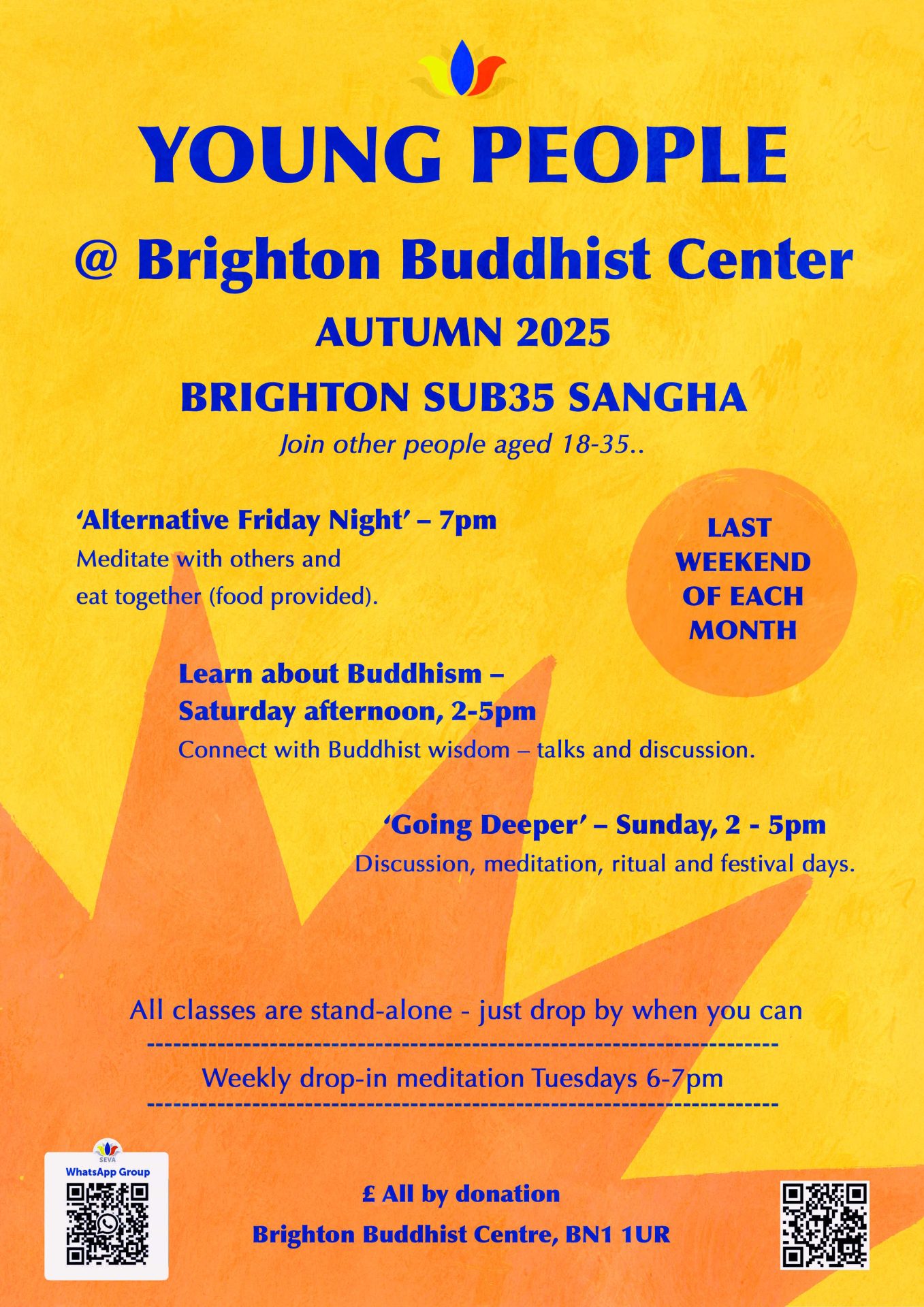 Join others aged 18-35. We hold weekly drop-in meditation classes on Tuesday evenings and themed events on the last weekend of each month.